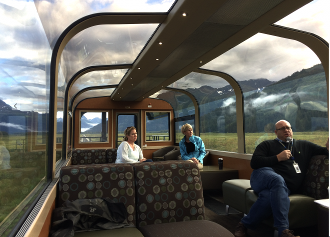 Even excellent glass-sided lounge cars (here I'm thinking about the beautiful Alaska Railroad Gold Star service cars) still anchor the passenger at window height. On the other hand, domes change three things simultaneously. Domes change sightlines, so that passengers see over vegetation, fences, berms, and freight consists. Domes change orientation, so passengers perceive the curvature of terrain and sky continuity. And domes mean shared attention. Everyone faces outward together, which subtly encourages conversation in a way forward-facing seating does not.