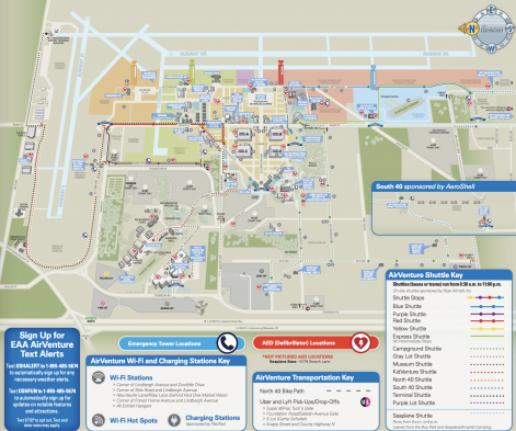 The Yellow line connects passengers from the north heading south to catch either the Blue line – a run of more than a mile and a half from close to the show center to the South 40 – or the Green Express line, a no-stops tram between the makeshift “Transit Center” where the Yellow, Blue, and Green all connect, and the South 40. The Purple line runs a shorter but very heavily used loop around the Warbirds parking area, where nearly 400 World War II-era aircraft wait their turn to take to the skies every afternoon.