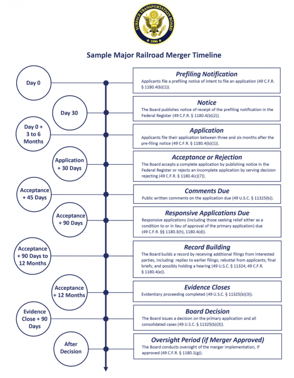 The Board’s communications team has done a real public service this week in creating a separate landing page on its website for information on mergers and how the STB is involved in considering them. It’s very much worth your while to go look over those materials. Of particular note is this visual timeline of how merger transactions, generally, go through the STB process...a process Federal law explicitly grants STB the authority to execute.